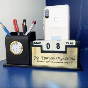 The image shows a black wooden pen stand with a built-in clock and calendar. The pen holder section is on the left, while the clock is embedded in the front of it. The clock face is white with black Roman numerals and gold hands. To the right of the pen holder is a manual calendar with three sets of rotatable blocks displaying the month, date, and day of the week. A gold-colored plate below the calendar has the text “Savri Personalized Gifts” printed on it, with space below for “Designation And Organisation Name Here.” The overall design is simple and functional, suitable for office or desk use.